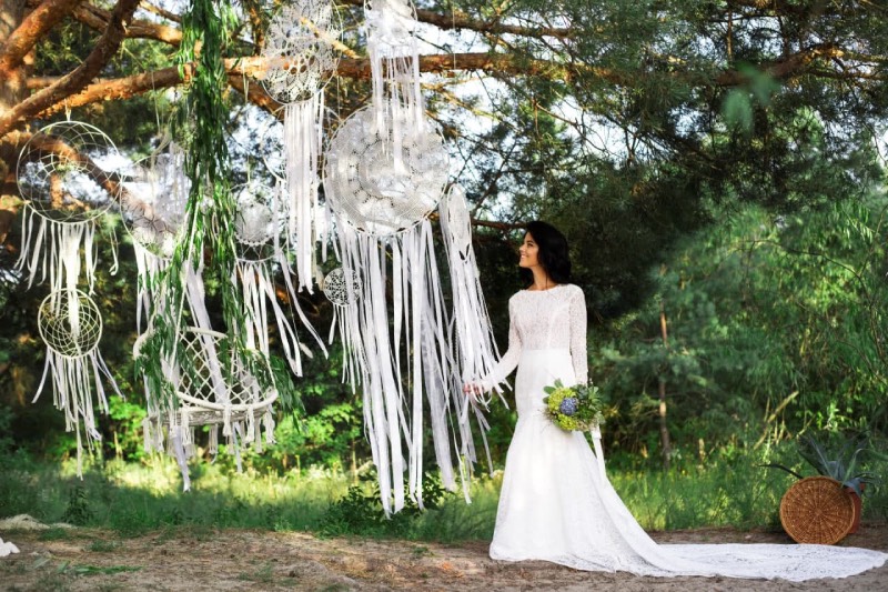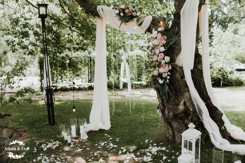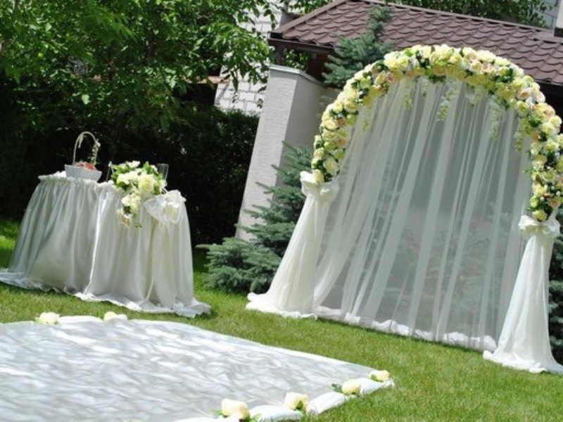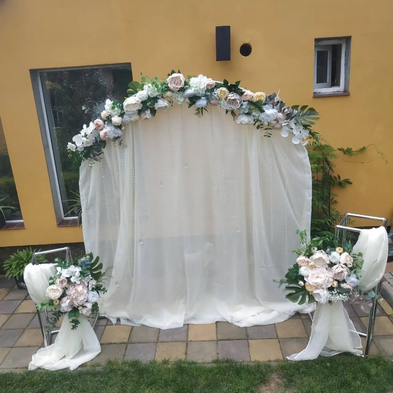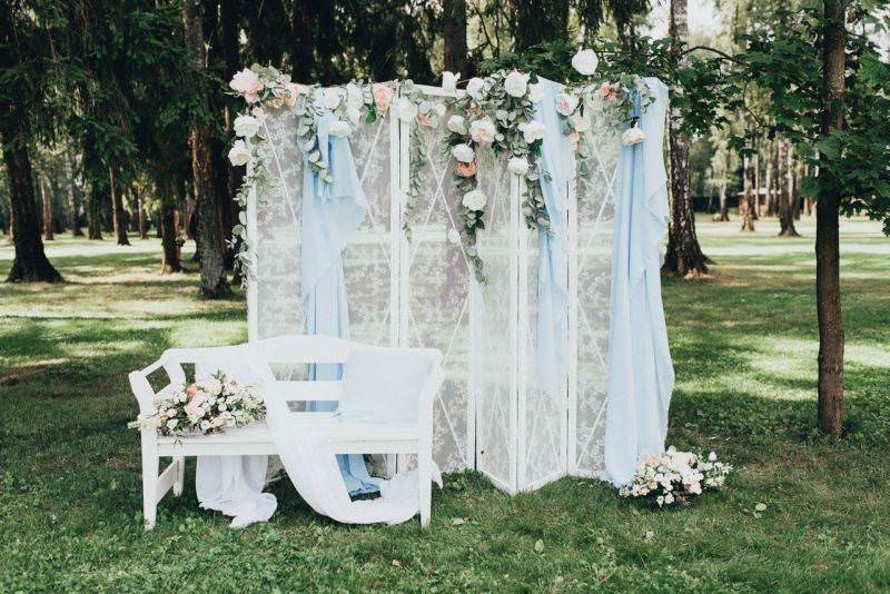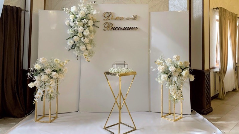 Весільна фотозона має бути ніжною та романтичною. Використовуйте багато квітів, фатину, легкі тканини. Додайте гірлянди з лампочок, світлодіодні елементи, написи «Love», «Just Married». Колірна палітра – біла, кремова, пастельна.