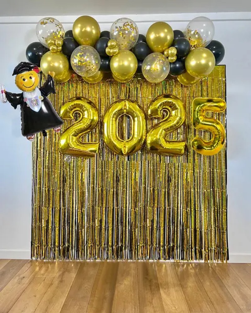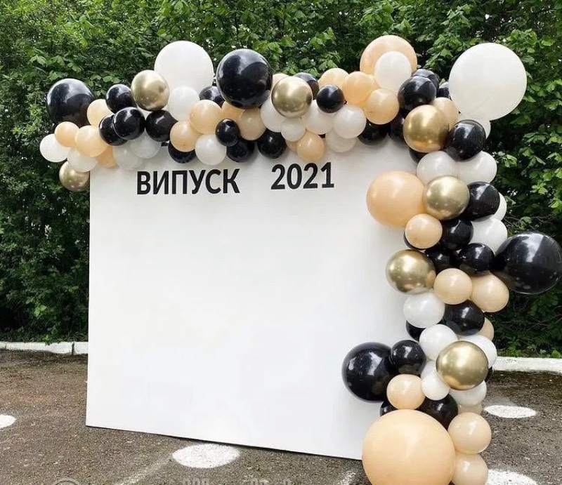 Випускний – це поєднання стилю і елегантності. Фотозона може включати гірлянди з лампочок, стрічки, класичні банери із написами. Колірна гамма – золото, срібло, чорний, білий. Декор можна доповнити капелюхами, дипломами, символічними аксесуарами.