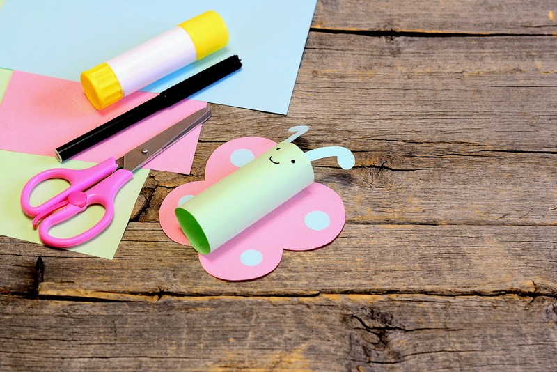 Для метелика знадобляться різноколірний папір для крил, світлий папір для тулуба, ножиці, клей і фломастери. Спершу вирізають два великі овали — крила, потім світлий овальний тулуб. Тулуб приклеюють посередині між крилами, а потім малюють очі й посмішку. На крилах створюють візерунки за допомогою фломастерів або дрібних паперових деталей.