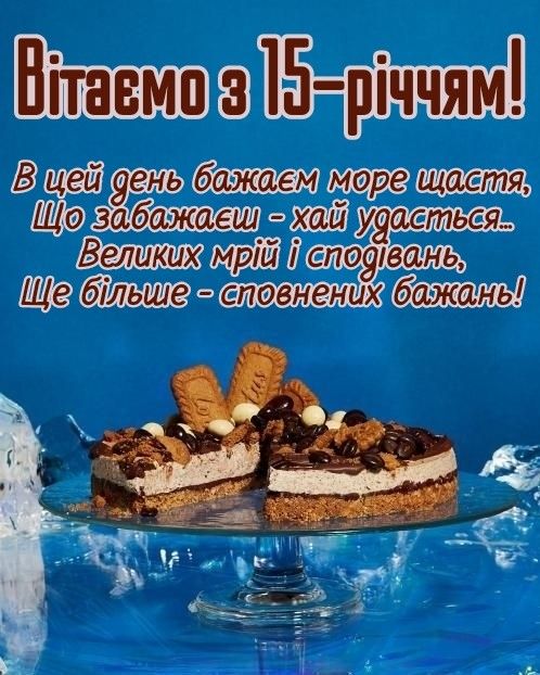 Вітаю з 15-річчям, з віком юних мрій і солодких надій. Бажаю в цей рік зуміти збагнути, чого бажає твоє серце, відкрити дорогу до нових досягнень, відчути в собі великі сили і усвідомити себе цілком упевненою і славною людиною.