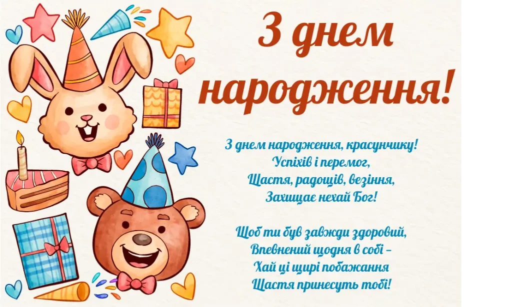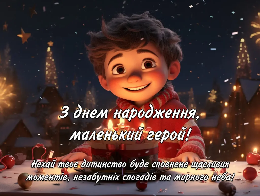 Вітаю з Днем Народження! Нехай будь-які твої дитячі мрії здійснюються! Здоров’я, щастя, ще більше уваги рідних! Рухайся вперед легко і без турбот! Попереду на тебе чекає багато цікавого, захопливого та дивовижного!