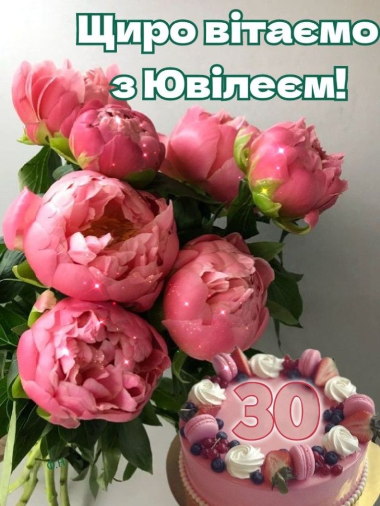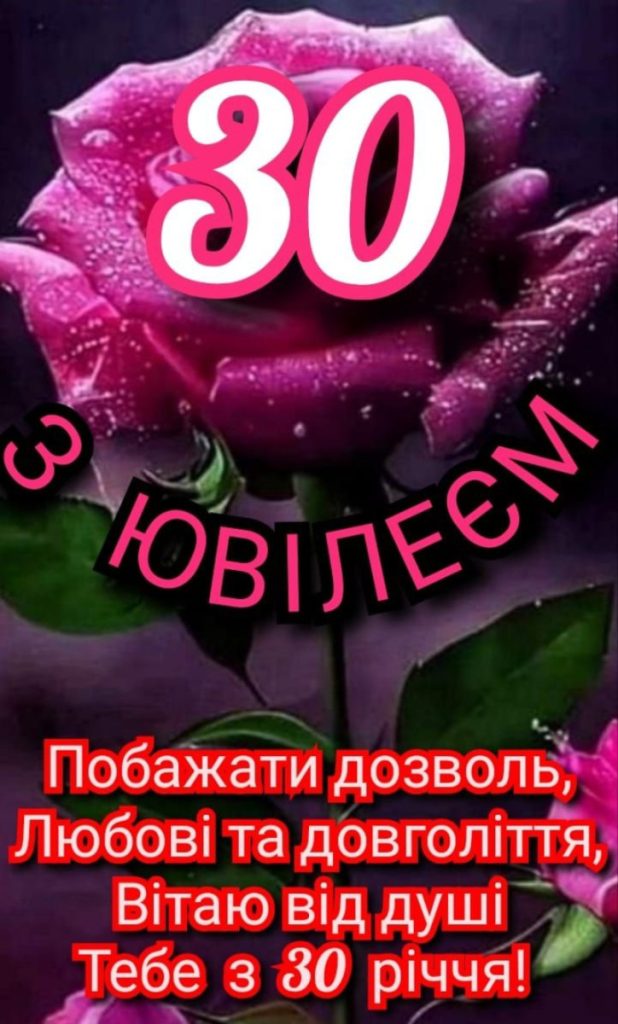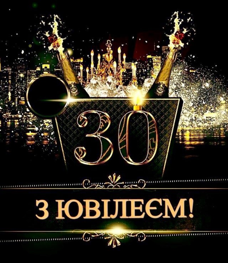 Вітаємо з чудовим ювілеєм! Нехай 30 років стануть початком періоду, коли усе вдається легко й радісно. Бажаємо тепла у серці, любові поруч і впевненості в кожному кроці. Нехай очі сяють від щастя, а доля дарує лише приємні сюрпризи.
