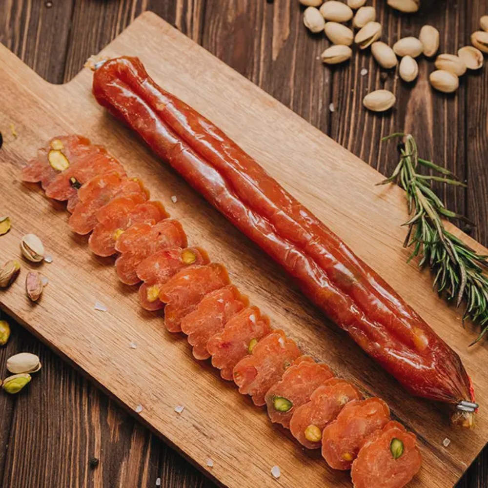Одним из ярких примеров ассортимента является колбаса курхан с фисташкой, которая демонстрирует фирменный подход к созданию деликатесов. Такой продукт объединяет мягкость куриного мяса, пряные оттенки и легкую ореховую нотку, создавая гармоничное вкусовое впечатление.