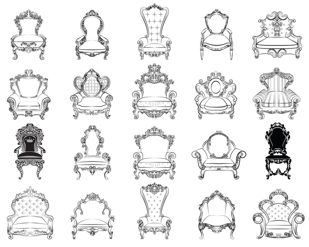 Крісло в стилі бароко – це вже історія про декор. Тут важлива не швидкість, а уважність. Почніть із загального силуету: широка спинка, вигнуті ніжки, масивне сидіння. Далі – орнаменти. Завитки, листя, декоративні елементи. Не намагайтеся зробити їх ідеально симетричними. У бароко є певна “надмірність”, і це нормально.