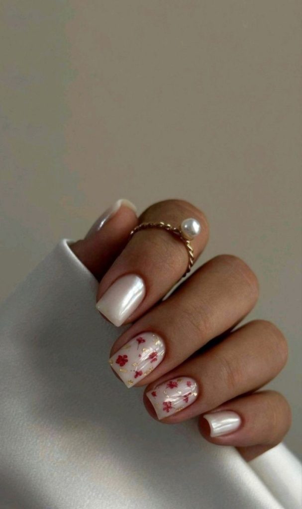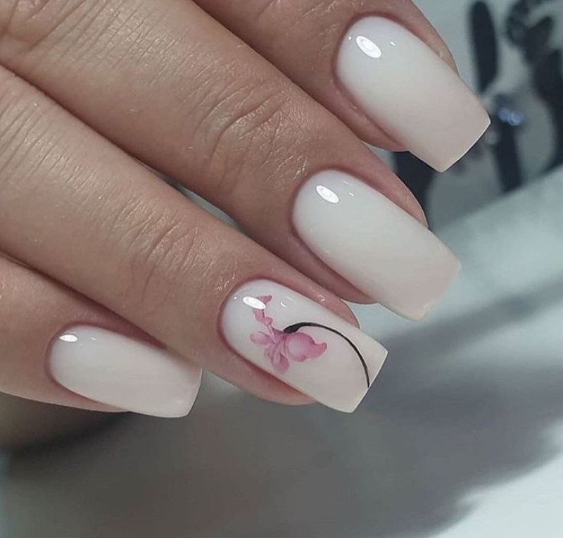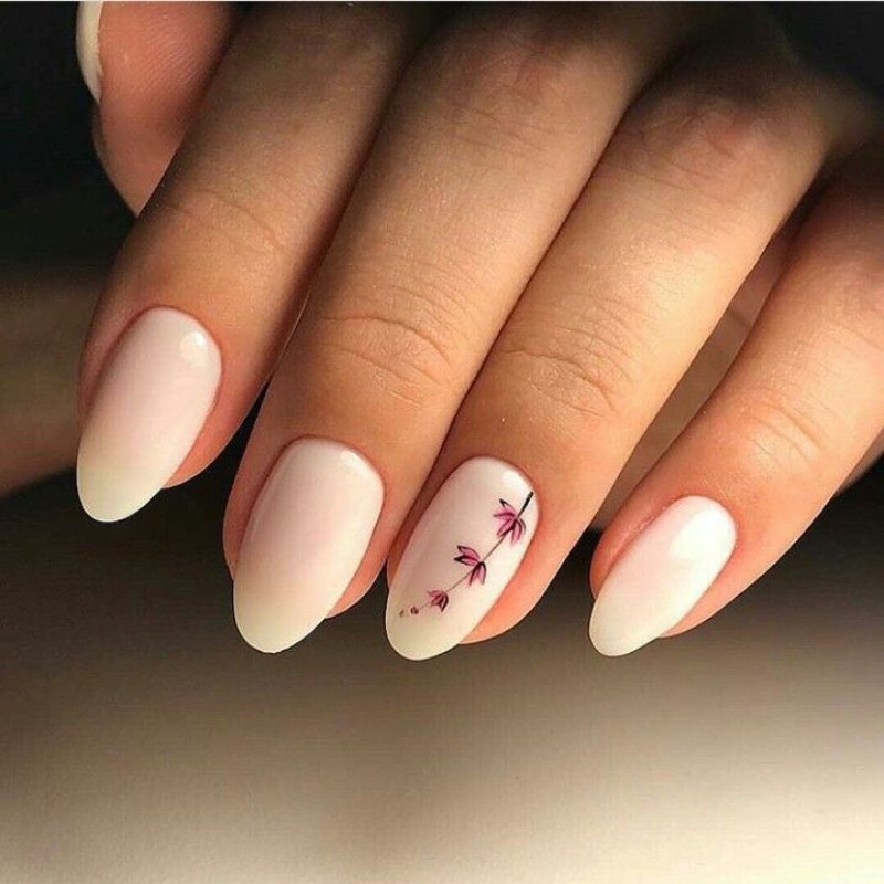 Один із найжіночніших варіантів. Рожевий колір у поєднанні з бутончиками або пелюстками створює м’який романтичний образ. - Молочний манікюр з квітковими елементами.