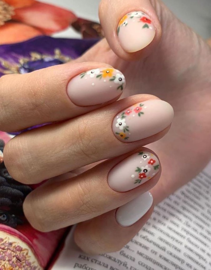 Ідеальне рішення для повсякденного образу. Нюдовий фон дозволяє квітам виглядати ніжно та витончено. - Весняний дизайн нігтів з квітами.