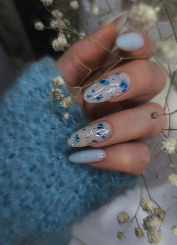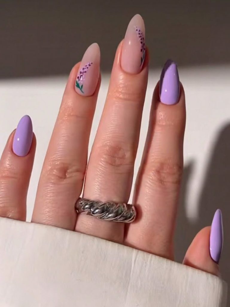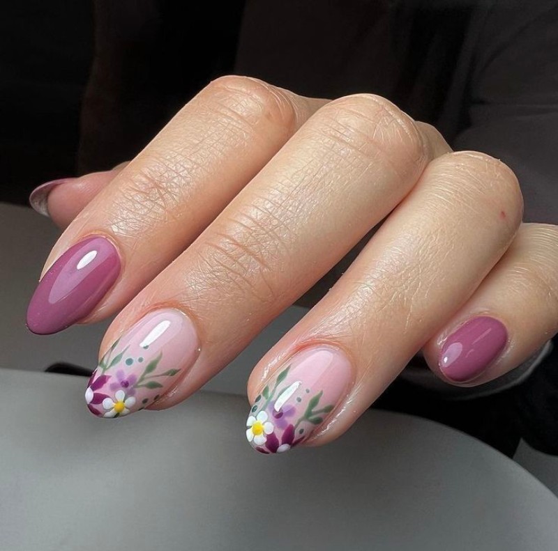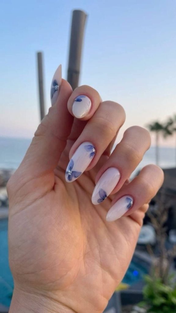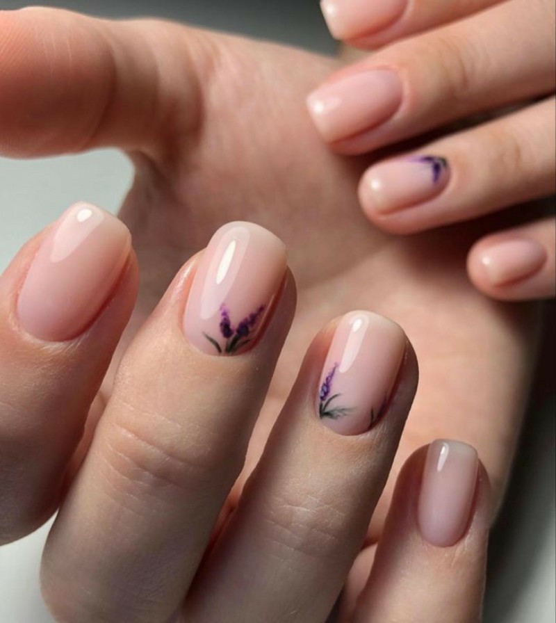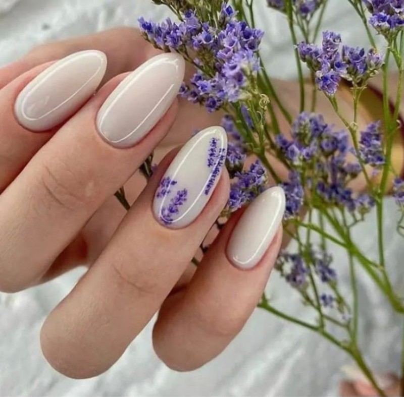 Молочна база гармонійно поєднується з біло-рожевими або синіми бутонами, надаючи ефекту прозорості. - Фіолетовий манікюр з квітами.