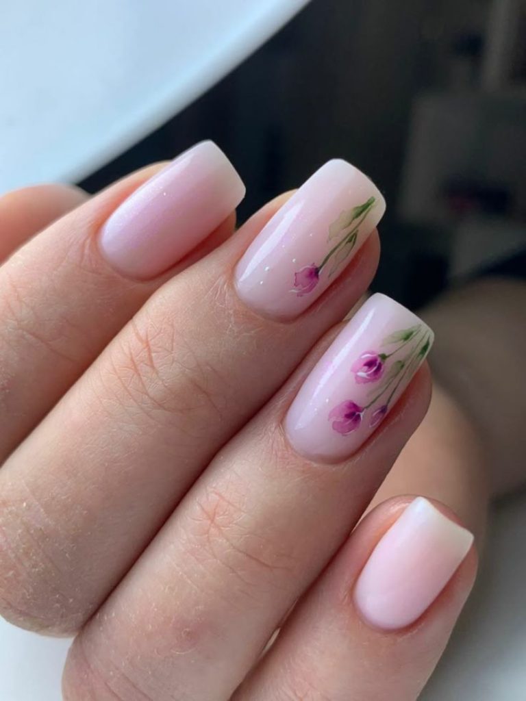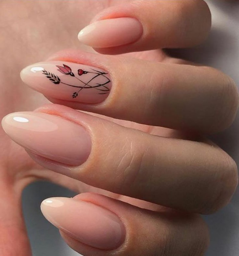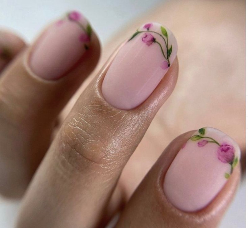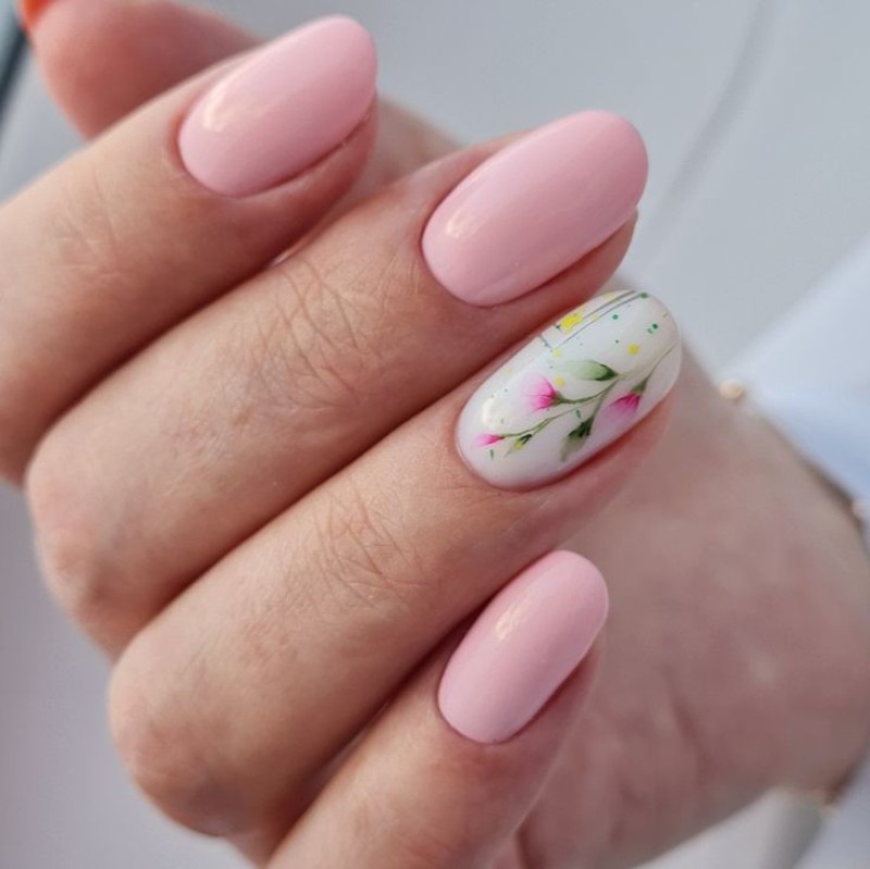 Класична база з додаванням тонких флористичних елементів на одному або кількох нігтях виглядає стильно й лаконічно. - Рожевий манікюр з квітами.