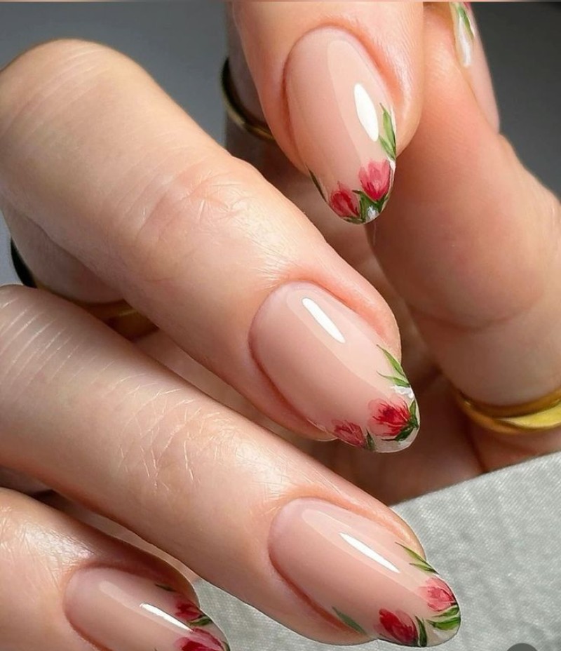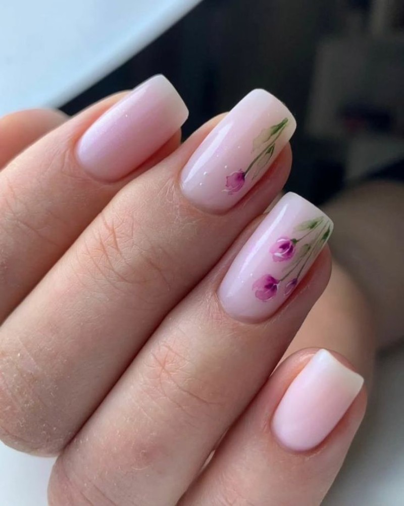 У цьому стилі переважають пастельні відтінки, поєднані з квітами сакури, тюльпанів або пролісків. - Французький манікюр з квітковим оформленням.