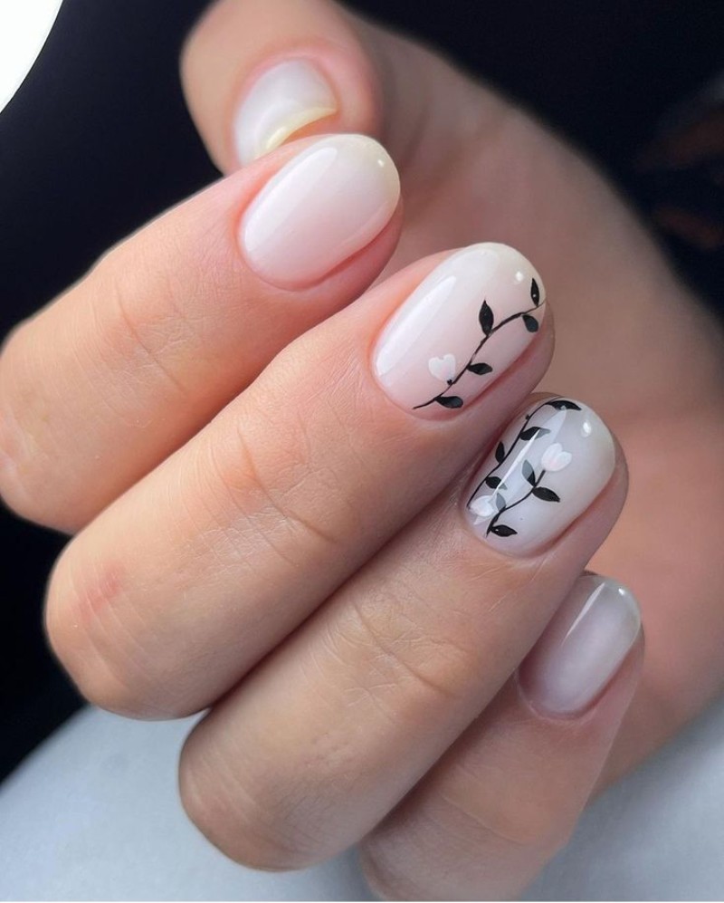 Компактний nail-дизайн не обмежує творчість. Лаконічні візерунки чудово виглядають і на невеликій довжині. - Ефект “розмитих” бутонів на прозорій базі